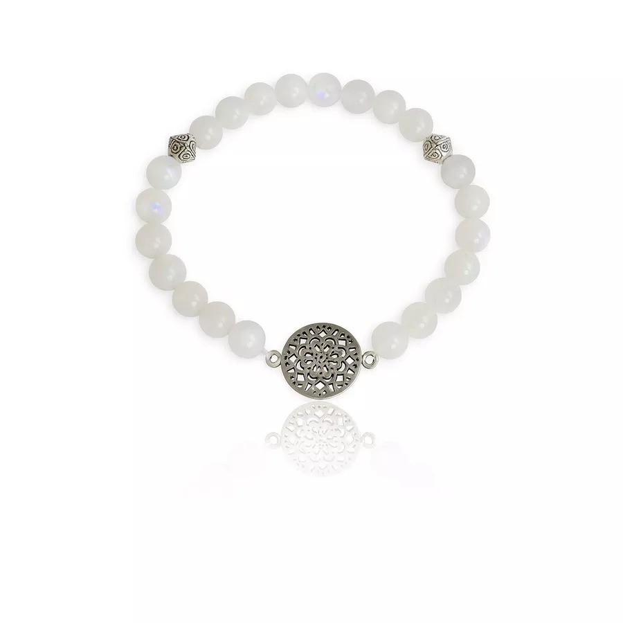 Тактильные ощущения от гладких камней помогают переключить внимание в моменты стресса — это простой и эффективный инструмент, основанный на принципах поведенческой психологии: внешние сигналы помогают мозгу быстрее возвращаться к выбранному состоянию. Подвеска-мандала в центре браслета подчёркивает идею внутреннего порядка и гармонии, добавляя образу аккуратный акцент.