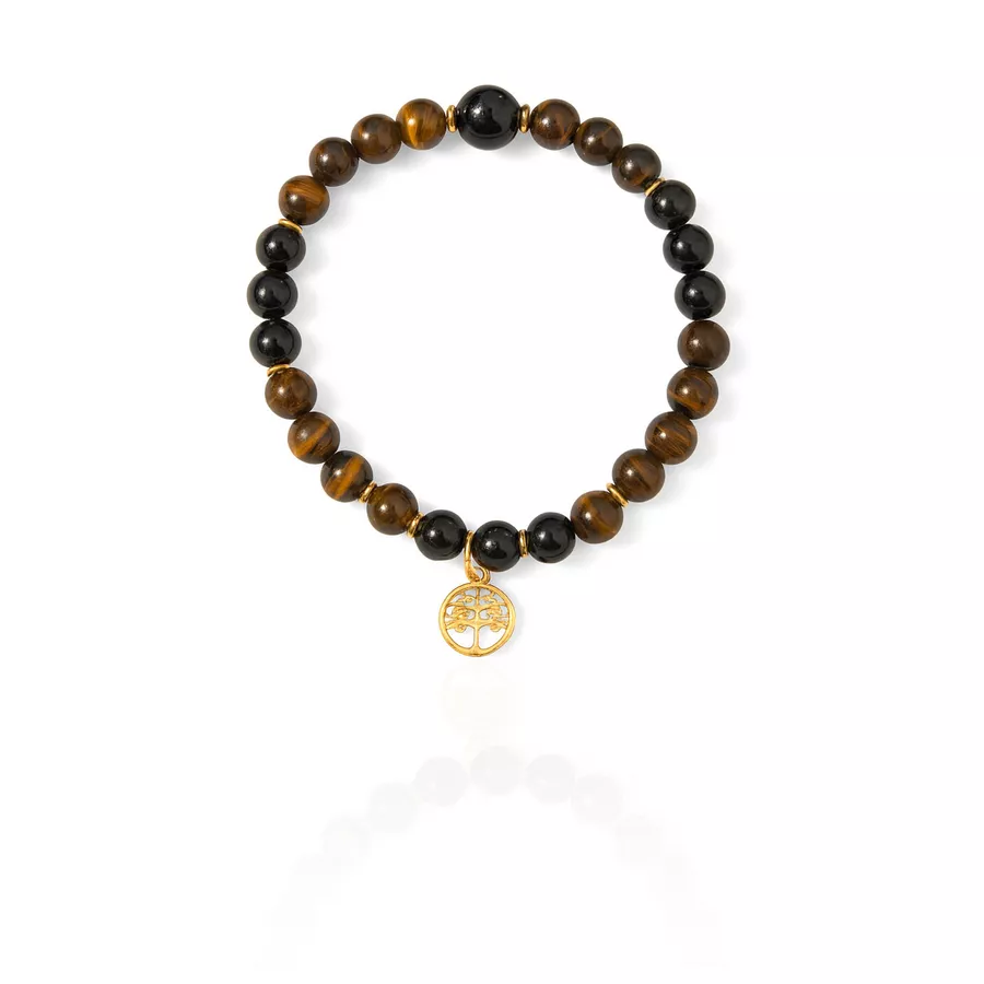 Этот браслет сочетает глубокие оттенки тигрового глаза и глянцевые чёрные вставки, создавая визуальный образ силы и устойчивости. Тигровый глаз известен своей выразительной структурой, которая напоминает об уверенности, ясности мысли и способности сохранять хладнокровие в напряжённых ситуациях. Такой аксессуар легко становится ежедневным напоминанием о внутреннем стержне и способности уверенно действовать.