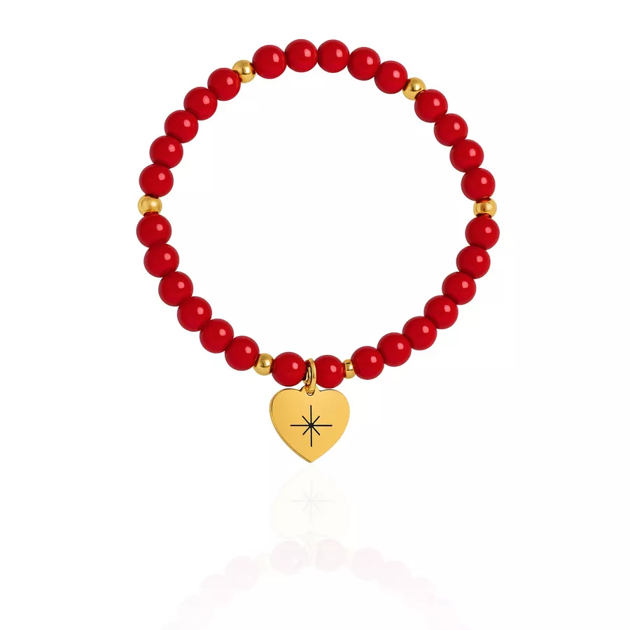 Красный цвет традиционно ассоциируется с жизненной силой и мотивацией, а тактильное ощущение бусин может служить небольшим якорем внимания — помогает сосредоточиться, собраться с мыслями или добавить решительности в важных моментах. Подвеска-сердце из золотистого металла завершает композицию и добавляет браслету современный, стильный акцент.